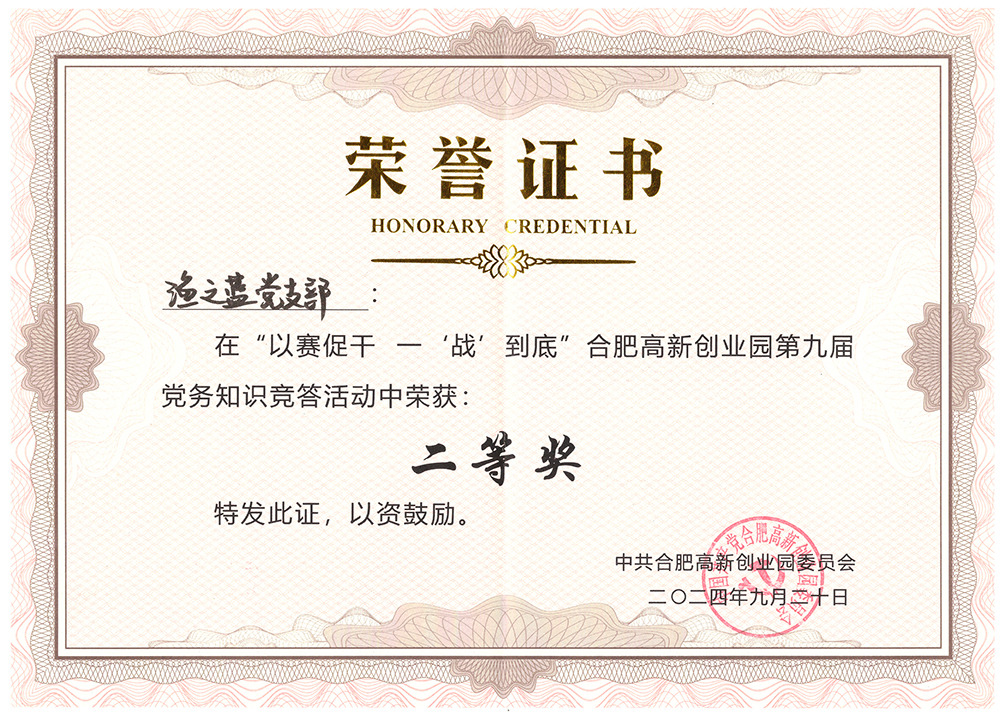 9月20日,合肥高新創(chuàng)業(yè)園黨委開展“以賽促干 一‘戰(zhàn)’到底”第九屆黨務(wù)知識(shí)競(jìng)答活動(dòng)。漁之藍(lán)黨支部參賽代表隊(duì)再次榮獲二等獎(jiǎng)。