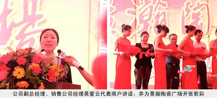 在景瀚陶瓷廣場落成開業(yè)慶典儀式上,公司副總吳愛云受王耀董事長委托,代表景德鎮(zhèn)陶瓷股份有限公司,代表紅葉陶瓷1號店,代表所有進駐的業(yè)主們發(fā)言。她說:今天是五星級陶瓷購物天堂——景瀚陶瓷廣場開業(yè)的大好日子,受王耀董事長委托,我僅代表景德鎮(zhèn)陶瓷股份有限公司,代表紅葉陶瓷1號店,代表所有進駐的業(yè)主們,對景翰陶瓷廣場的開業(yè)表示熱烈的祝賀。祝景瀚陶瓷廣場開業(yè)大吉,生意興隆。