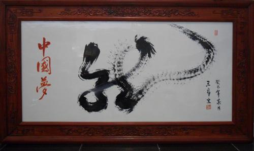 在當天的活動中,王易生的草書一筆龍,已達到了較高的藝術(shù)境界,其一氣呵成的書寫方式在書畫界更是一絕。“龍”字的前部象征著中華兒女祈福納祥,國泰民安;中部象征著中華大地改革之勢,波瀾壯闊;尾部象征著中華民族偉大復興、巨龍騰飛、正當其時?!褒埼病?,似騰龍奔逐,奇幻莫測,給人極強的心靈震撼。
