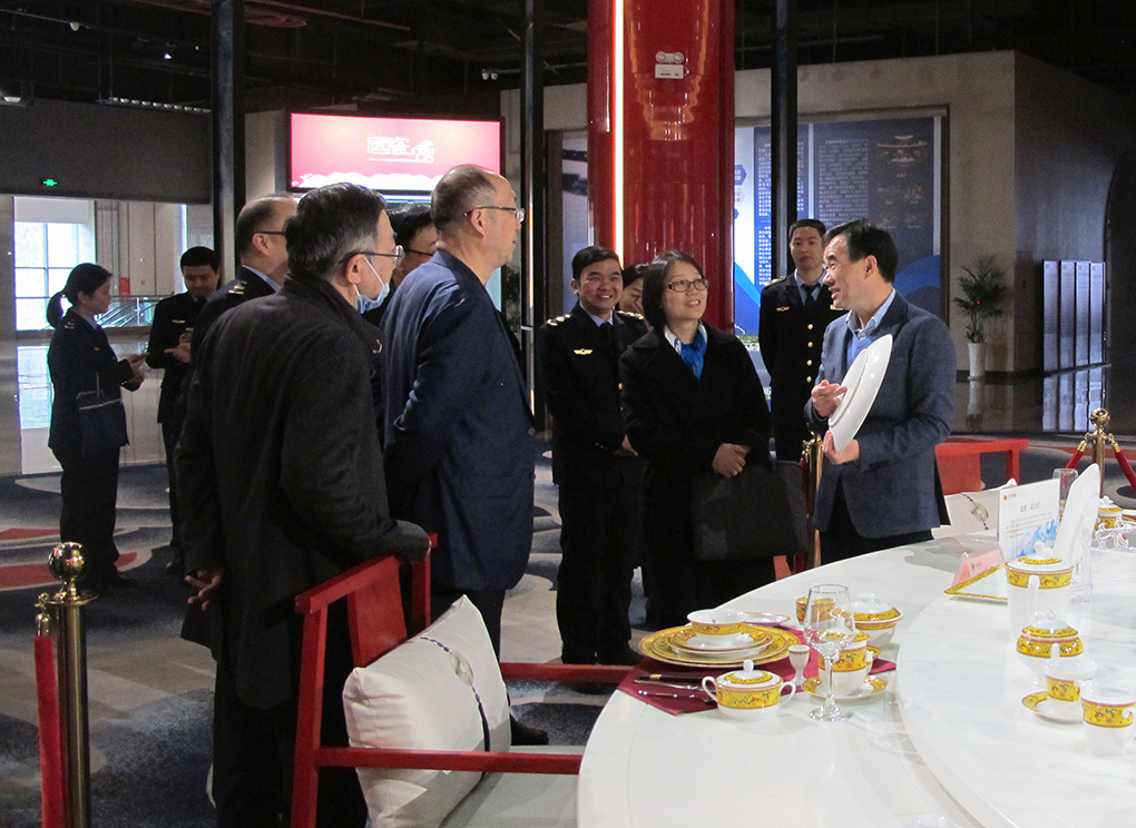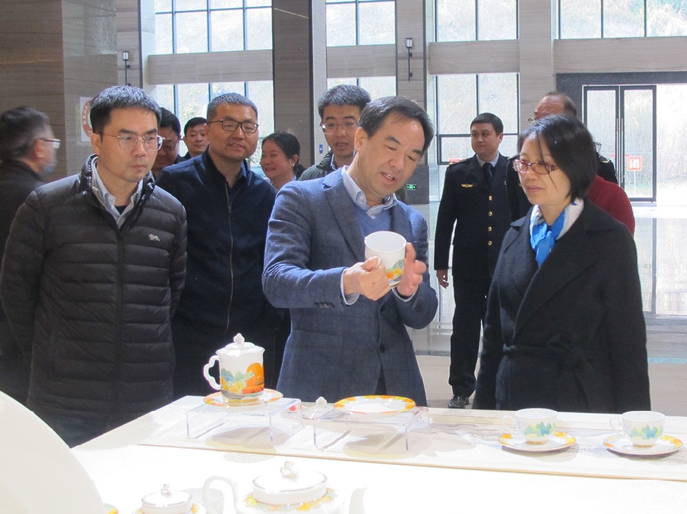 在國瓷館參觀考察期間,周敏建向調(diào)研組一行簡要介紹了集團(tuán)公司發(fā)展歷程。大家邊走邊看,不時(shí)駐足拿起產(chǎn)品仔細(xì)品鑒或拍照。周敏建在介紹“國瓷紅葉”產(chǎn)品特色時(shí)詳細(xì)講解了陶瓷生產(chǎn)工藝,講述了一套套有關(guān)“國瓷”的故事。