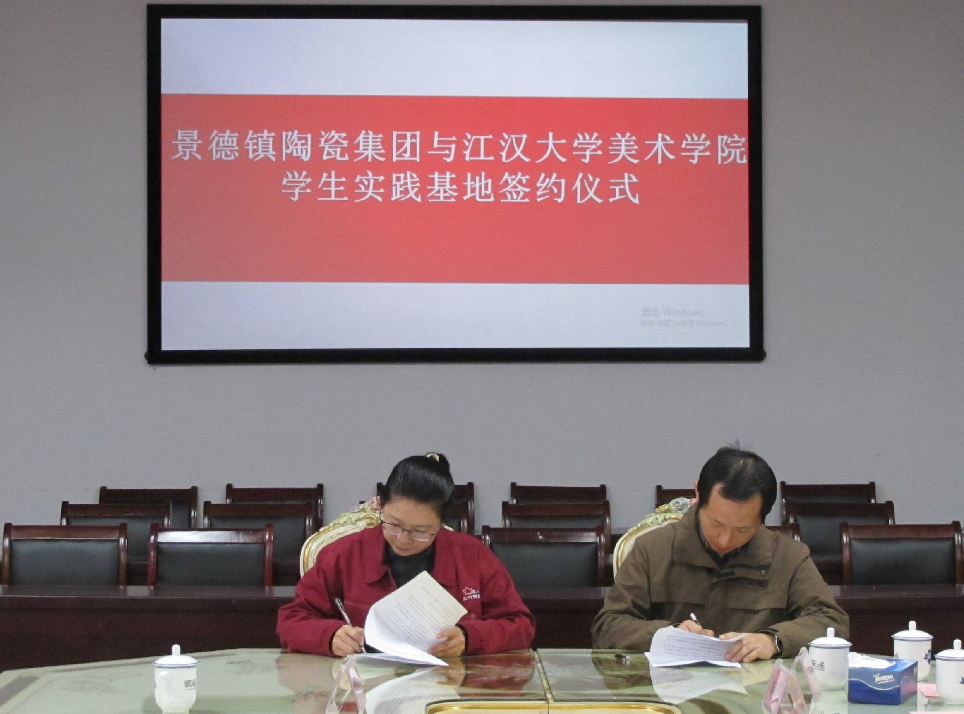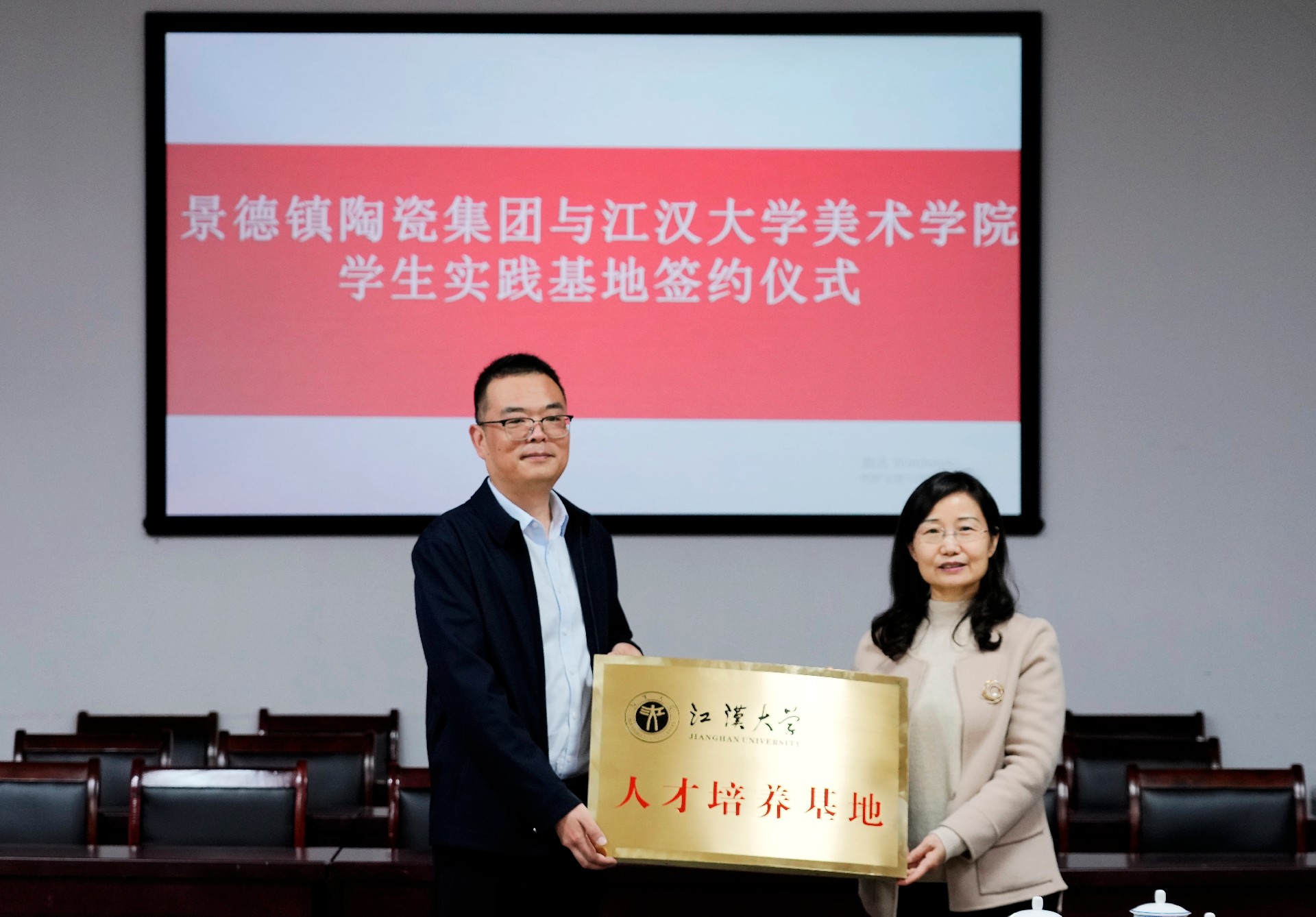 會(huì)上,舉行了江漢大學(xué)美術(shù)學(xué)院與景陶集團(tuán)“共建學(xué)生實(shí)踐基地”簽約授牌儀式。集團(tuán)人力資源部部長(zhǎng)薛景玉、江漢大學(xué)美術(shù)學(xué)院副院長(zhǎng)馬杰分別代表雙方初步簽訂了《校外實(shí)習(xí)基地建設(shè)協(xié)議書(shū)》,江漢大學(xué)美術(shù)學(xué)院副書(shū)記楊緒軍代表江大美院捐贈(zèng)《江漢大學(xué)美術(shù)學(xué)院畢業(yè)作品集》等書(shū)籍。